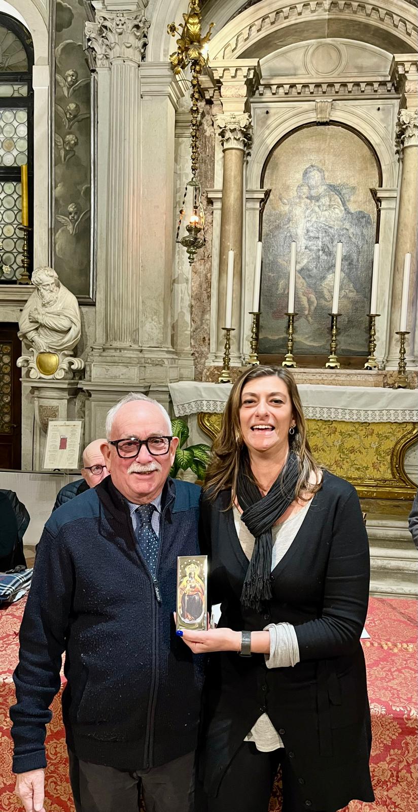 Il Guardian Grande Franco Campiutti consegna la tradizionale icona alla Consorella che ha estratto la “bala d’oro” in chiusura della riunione del Capitolo Generale della Scuola Grande dei Carmini.